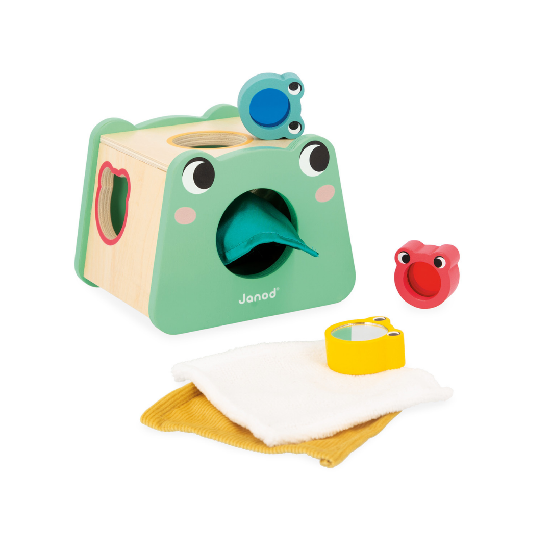 Houten kikkervorm-sorteerder met 3 kleurrijke babykikkertjes: elk vakje biedt een andere sensorische ervaring, zoals spiegel- en kleurfilters. Drie verschillende stoffen voegen extra textuur toe voor nog meer ontdekkingsplezier.