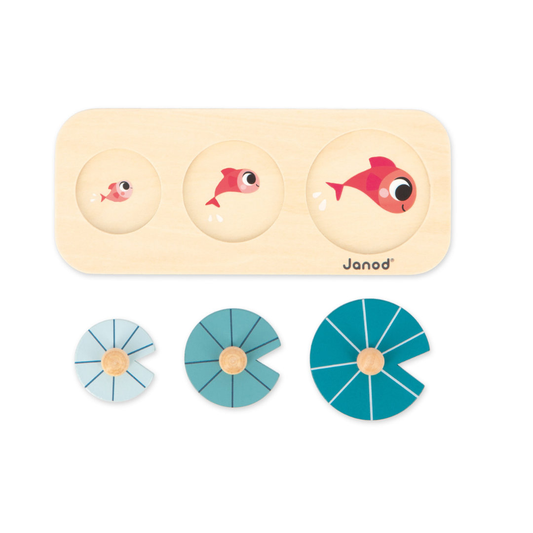 Houten puzzel met 3 stukjes en grepen: laat je baby de vijverbewoners ontdekken die zich verstoppen onder de waterlelies.