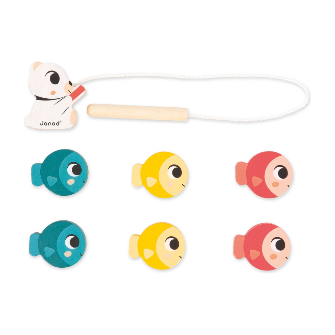6 visvormige rijgbeads: een leuke oefening voor hand-oogcoördinatie. Het houten hulpmiddel aan het uiteinde van het koord maakt rijgen makkelijk en leuk.
