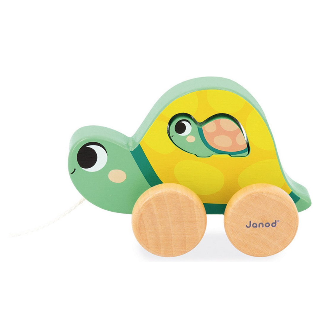 Houten trek-schildpad met baby: de kleine schildpad kan losgemaakt worden, zodat je kindje moeder schildpad op twee manieren kan voortbewegen – door aan het touwtje te trekken of haar bij de schelp vast te houden. Perfect om de eerste stapjes te zetten!