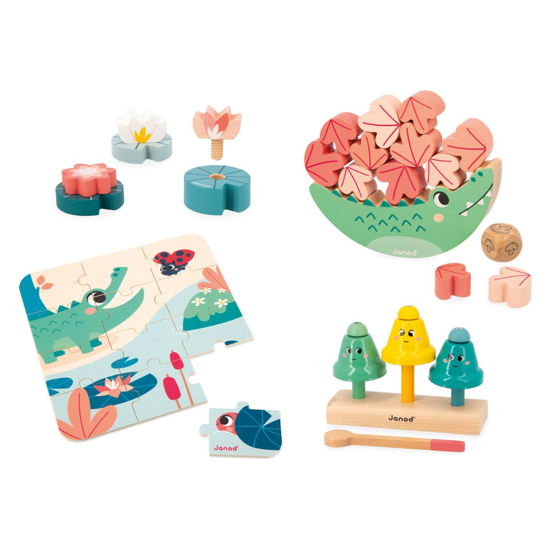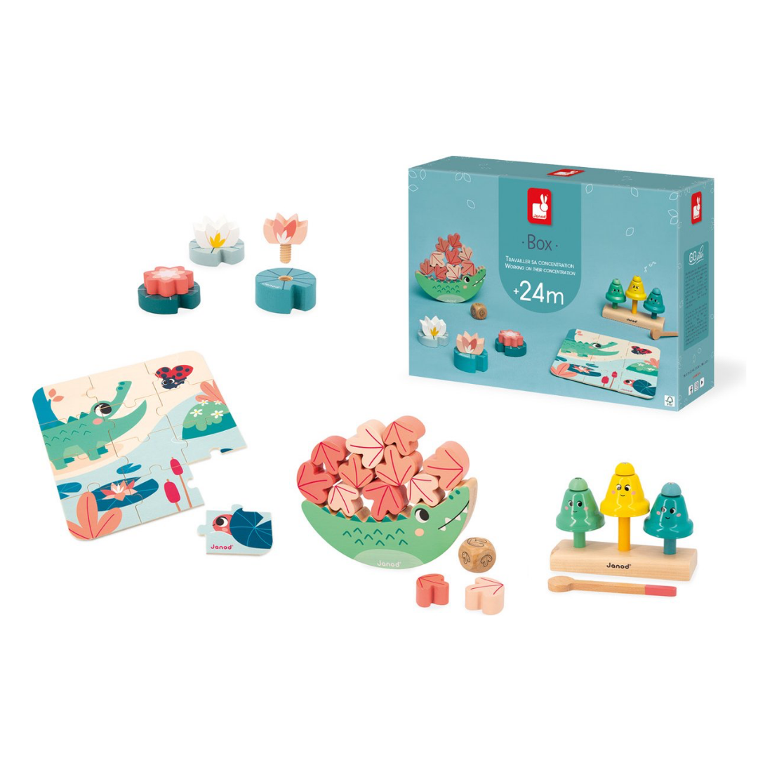 Ontdek, speel en leer met de Janod Box! Deze speelbox is speciaal ontworpen voor peuters vanaf 24 maanden en bevat 4 houten speelgoedjes die concentratie en precisie stimuleren.