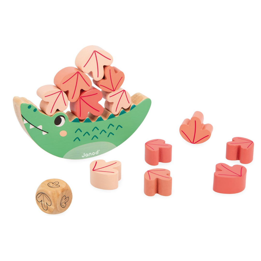 Houten krokodil-balansspel: stapel zo veel mogelijk houten blaadjes op de rug van de krokodil (12 inbegrepen). De blaadjes zijn in 2 maten voor extra uitdaging. Alleen of samen spelen kan, met of zonder dobbelsteenhulp.