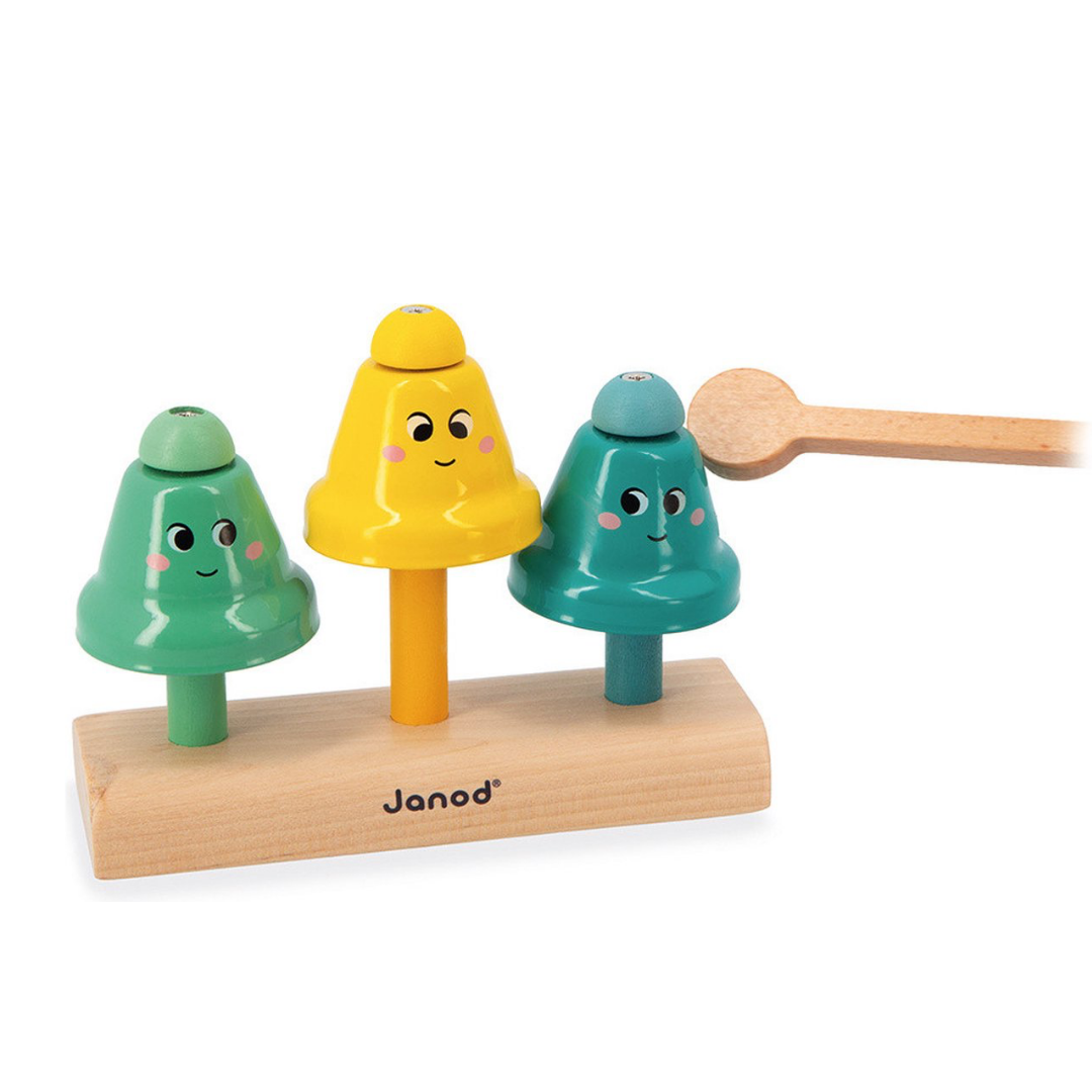 3 muzikale bellen met stokje: elke bel maakt een andere klank, waardoor je peuter spelenderwijs gehoor en ritmegevoel ontwikkelt.