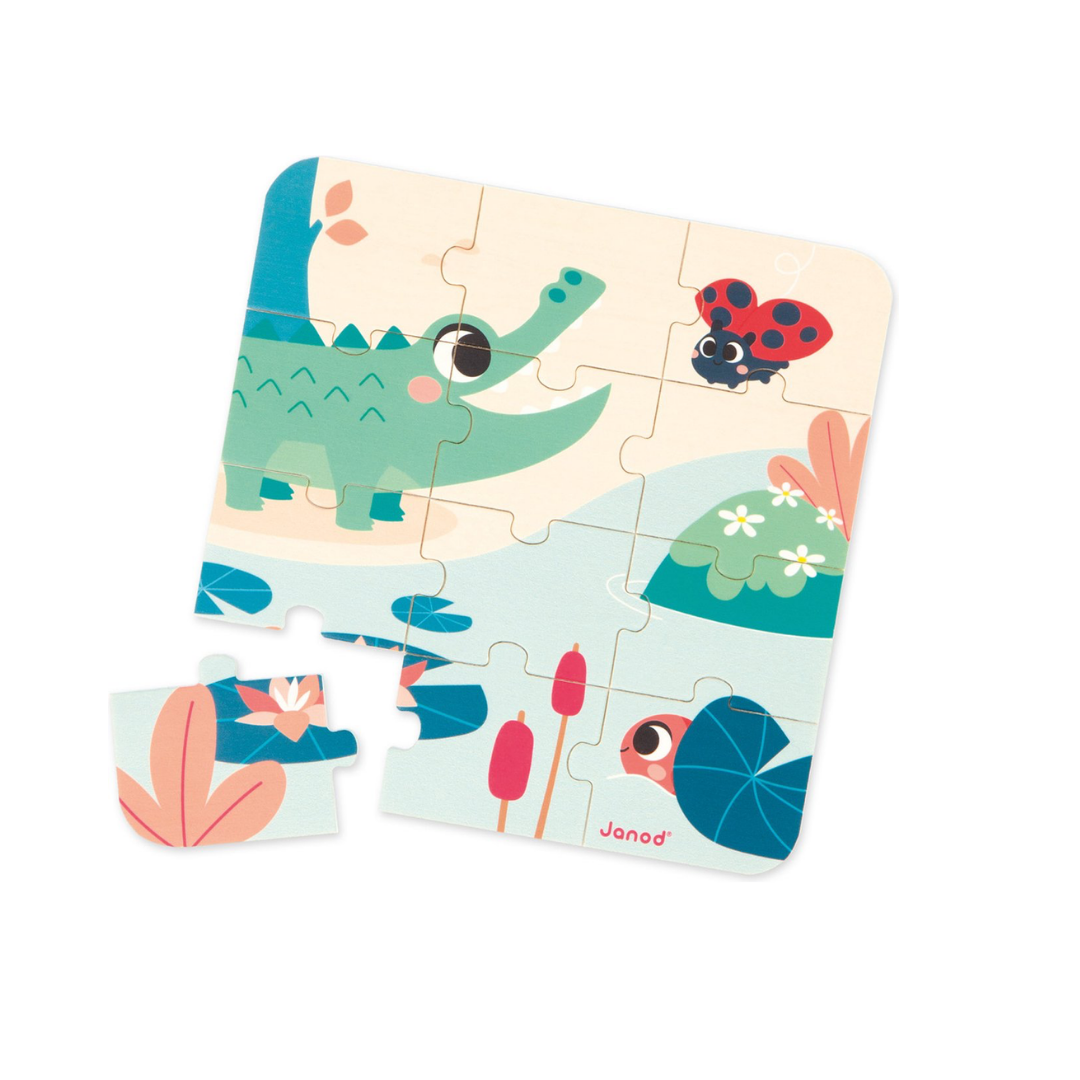 Houten puzzel met 12 stukjes: samen met de poster helpt deze puzzel bij het uitbreiden van woordenschat en het begrijpen van scènes, wat het redeneervermogen stimuleert.