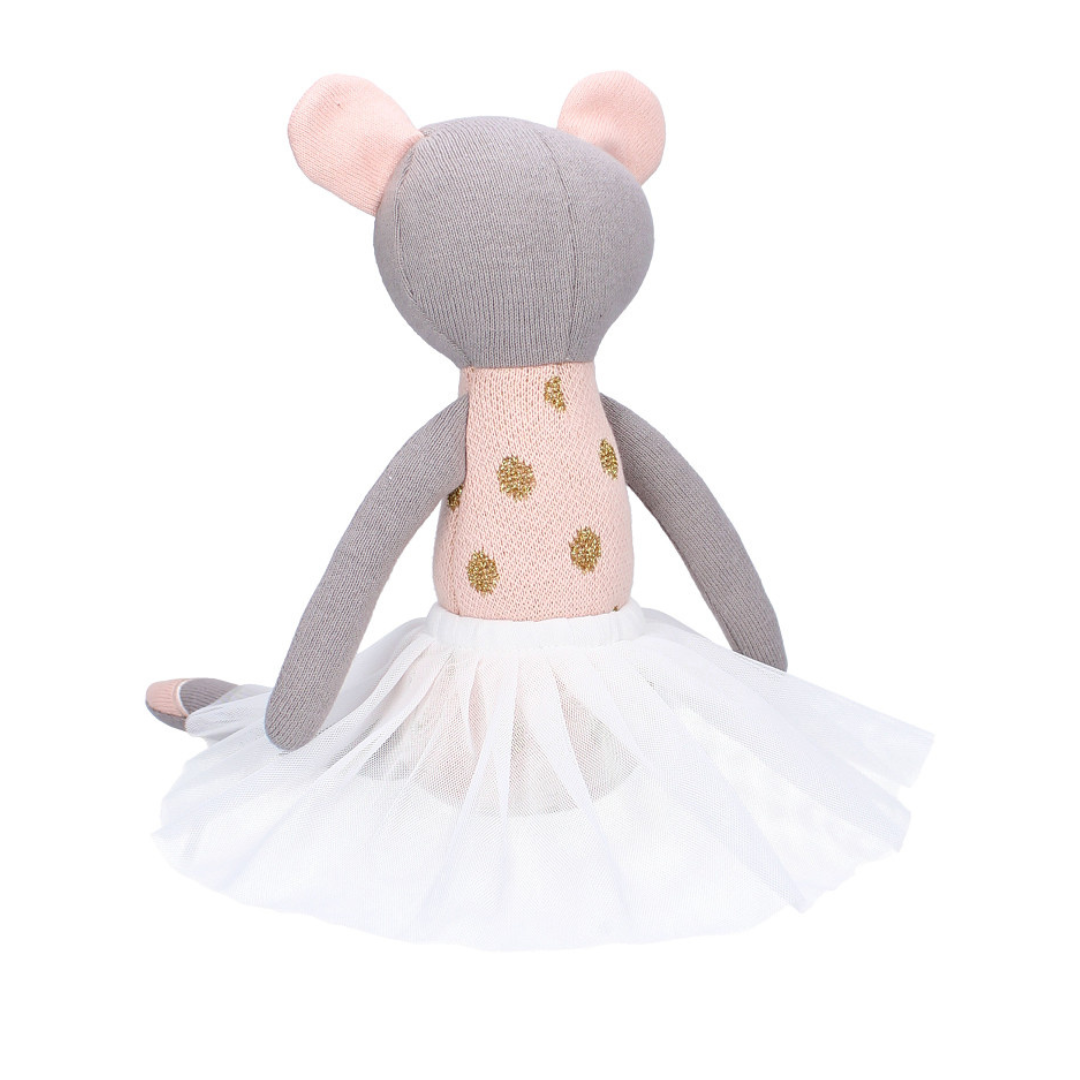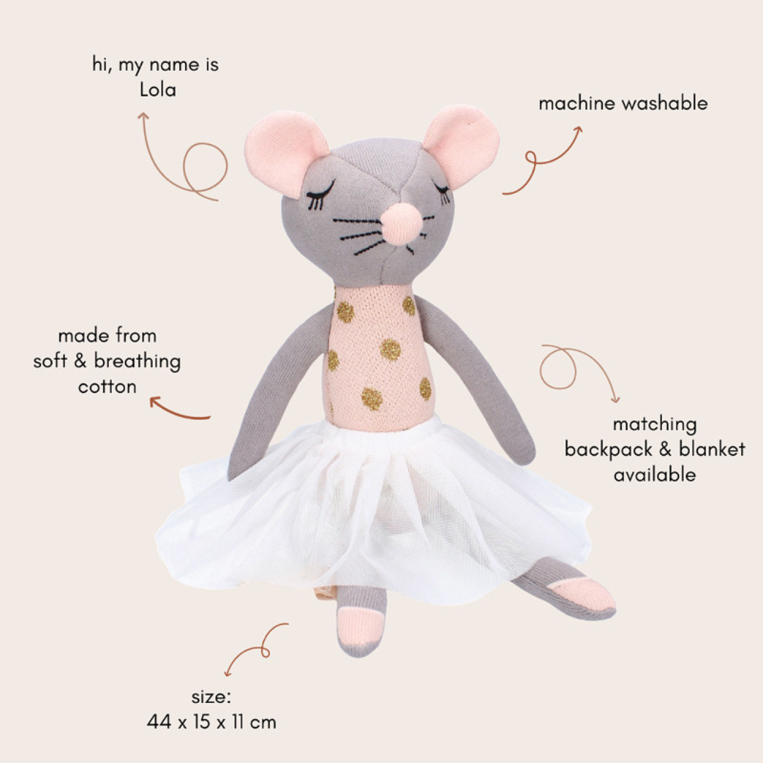 Deze lieve muizenknuffel uit de Cuddle Me Tight-collectie van Kidzroom is altijd in voor een dansje. Met haar zachte grijze vacht, schattige ballerina-outfit en vriendelijke glimlach is ze de perfecte speelkameraad. Lola is 40 cm hoog en 14 cm breed – ideaal om te knuffelen, spelen en natuurlijk… samen te dansen!
