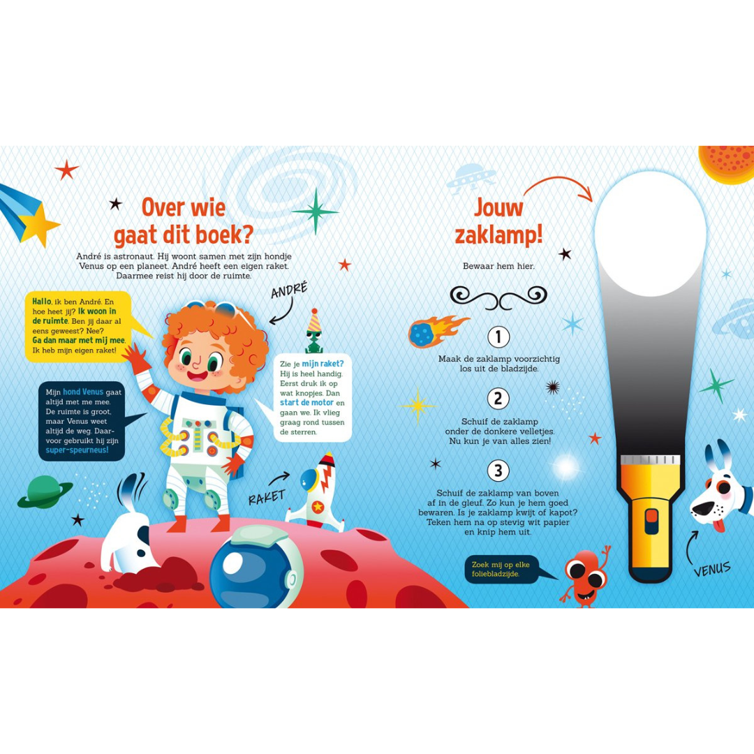 Reis naar de sterren en ontdek de geheimen van het universum met Speuren in de Ruimte! Dit unieke zoekboek wordt geleverd met een kartonnen zaklamp waarmee kinderen planeten, astronauten, raketten en meer ruimte-avonturen kunnen opsporen in de prachtige illustraties. Perfect om nieuwsgierigheid en fantasie over de ruimte te stimuleren.