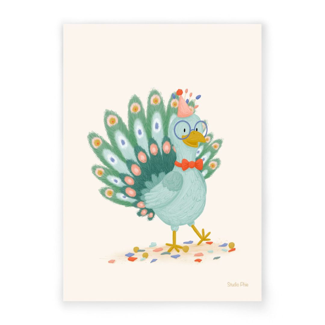 Breng kleur en flair in iemands dag met dit vrolijke Feestpauw kaartje van Studio Phie! Een persoonlijke kaart ontvangen blijft bijzonder, en met dit feestelijke ontwerp wordt het een echte eyecatcher. De elegante pauw met feesthoedje zorgt gegarandeerd voor een glimlach en maakt elke gelegenheid net dat beetje extra speciaal. Of het nu gaat om een verjaardag, een felicitatie of zomaar een verrassing, dit kaartje laat zien dat je aan iemand denkt
